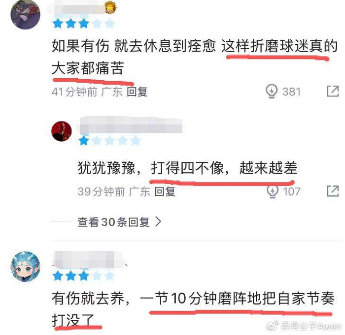胡明轩在进攻端的不够果决,也引起了自己球迷的不满:“如果有伤,就休息到痊愈,这样折磨球迷,大家都痛苦”、“有伤就去养,一节10分钟磨阵地,把自家节奏都打没了”。巅峰时期的胡明轩,曾在21年获得过FMVP,但这几年他不仅没有继续进步,反而是有走下坡路的趋势,反倒是此前给他替补的徐杰,逐渐蜕变为一名准MVP级别的球员。